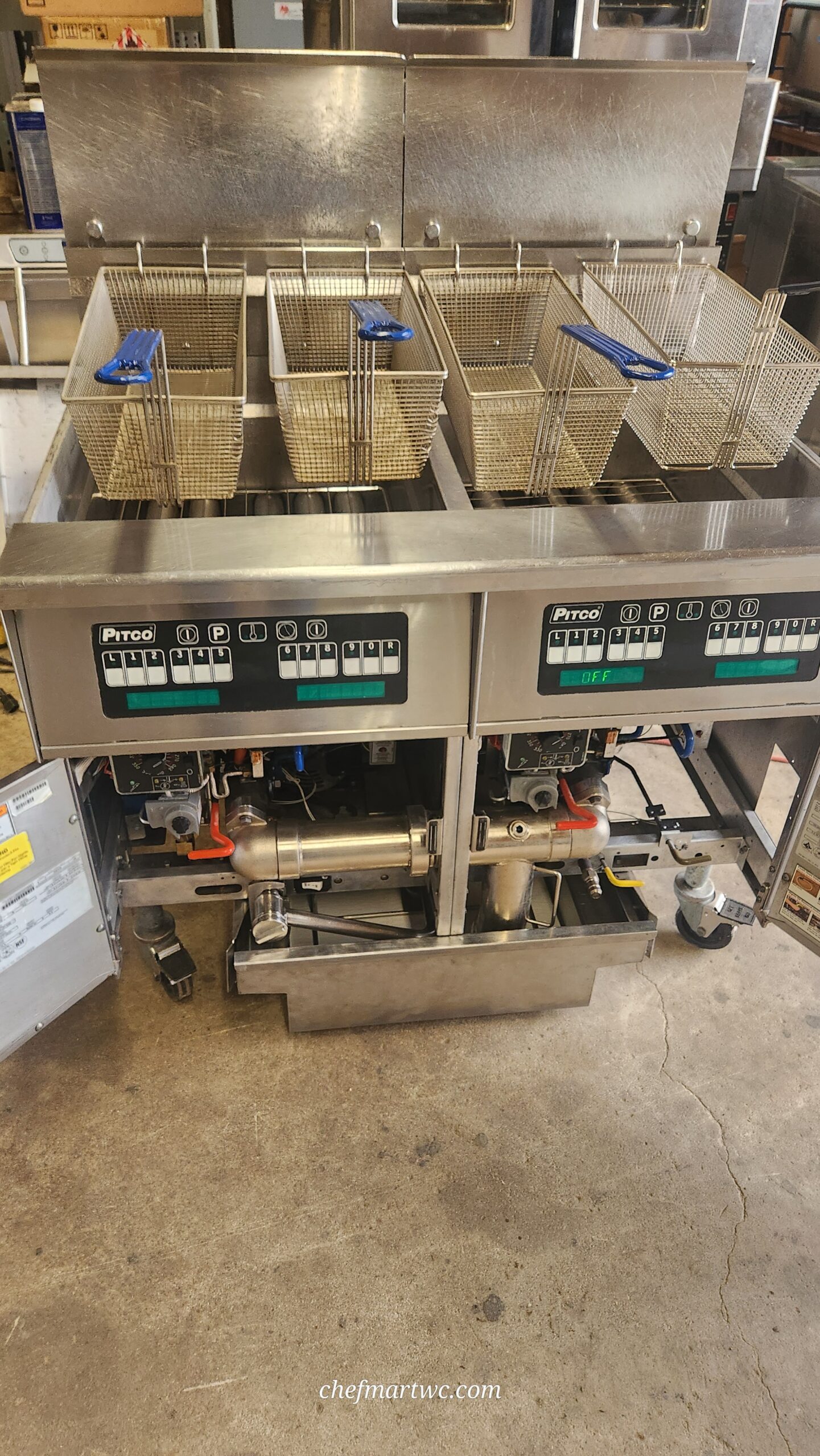Pitco SSH75-2FD fryer system consists of 2 75lb fryers , built in filter system, plumbed for waste oil dump, comes with i-12 controller boards as well as solid state control system for backup